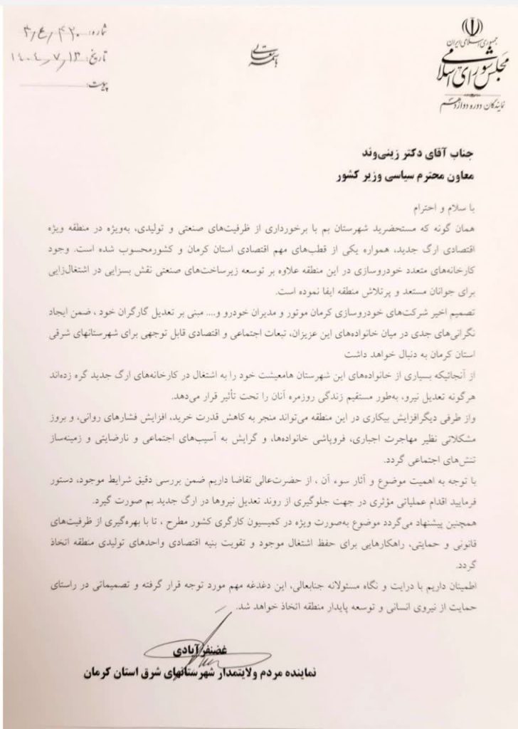 در جریان دیدار امروز دوشنبه حجت‌الاسلام موسی غضنفرآبادی نماینده مردم شرق استان کرمان در مجلس شورای اسلامی، با علی زینی‌وند معاون سیاسی وزیر کشور، موضوع نگران‌کننده تعدیل نیرو در کارخانه‌های منطقه ارگ جدید بم به‌صورت جدی مطرح شد.